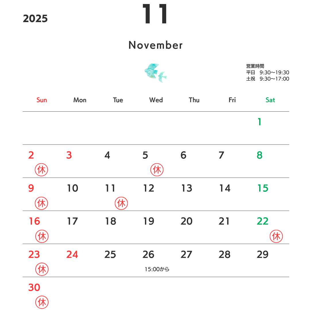 12日(水)、19日(水)、26日(水)は特別営業日(9時30分〜19時30分)です。