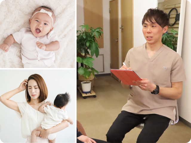 妊娠・出産による姿勢の変化や抱っこ・授乳の負担で、身体のコリや痛み、骨盤や背骨のゆがみが起こりやすくなります。